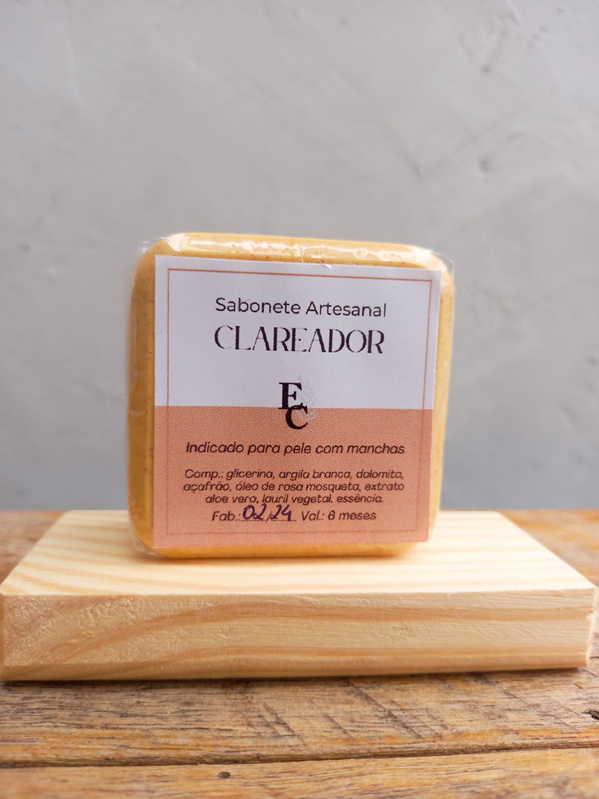 Glicerina, argila branca, dolomita, açafrão extrato aloe vera, lauril vegetal, essência, óleo de rosa mosqueta.